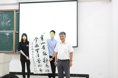 随即,张尧院长致辞。首先,他对新生们表示了热烈的欢迎,他说,来到华广是一个明智的选择,将会有锦绣的前程。他向新生们说明了电力行业的重要性以及学院教学的专业性,并介绍了学院的校外实习基地。他希望新生们能够以学为主,同时也要提高其它方面的能力和素养。他希望新生们牢记“书山有路勤为径,学海无涯苦作舟”,在新的起点追梦起航,学有所成。寄语过后,张尧院长将题字赠与2017级新生。