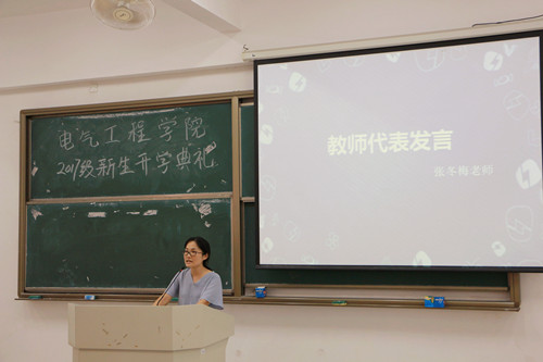 随后,电气工程学院配营教研室张冬梅老师发言,她热烈欢迎新同学的到来,并对他们的成长给予了几点期望:一是尽快适应大学环境,实现角色转换,重新再来、再接再厉,独立自主,自我约束;二是学习专业知识、掌握一技之长,具备综合发展能力、良好的人文素质;三是做好规划,兼顾效果与效率,抵制诱惑与干扰,投入学习与实践;四是自信、坚强地面对将会发生的一切。