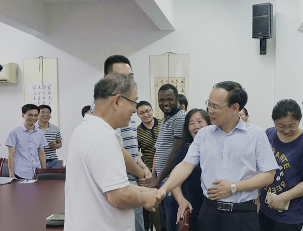 会议伊始,邱学青亲近教师队伍,与电气工程学院教职工一一握手。会上,张尧以“广东省特色重点学科——电力系统及其自动化”为切入口,从人才引进、教师培养、虚拟电力设计院的建设、电工进网作业许可证考点的建设、重点项目研究方向的建设等方面向邱学青一行进行了汇报,同时,也报告了建设过程中所遇到的问题。