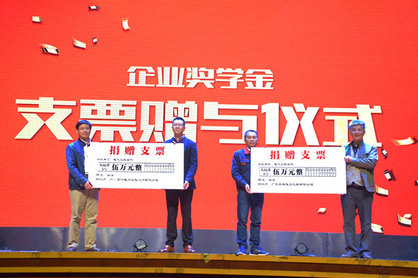 大会伊始,举行了“固源奖学金”、“技博奖学金”支票赠与仪式,由梁志力先生、游文东先生分别将五万元奖学金支票赠与电气工程学院。
