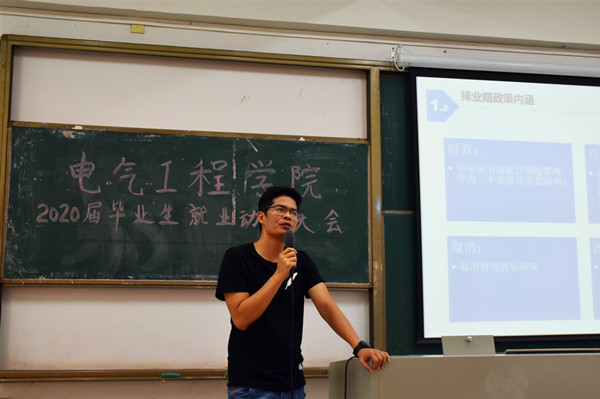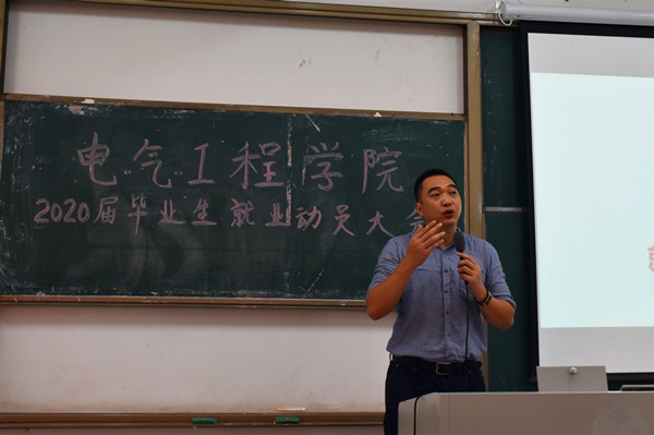 为做好毕业生爱国主义教育,树立正确的就业观,确保2016级学生顺利毕业,让2020届毕业生了解当前就业形势与政策, 10月10日下午,电气工程学院2020届毕业生就业动员大会于教学楼A5-201召开。出席大会的有电气工程学院副院长郭培虹,学校工作处就业指导中心主任梁伟滔,学院就业专员刘海权,2020届毕业生辅导员林斌,年级教务员林泽梅,各班班主任以及全体毕业生。林斌主持本次动员会。